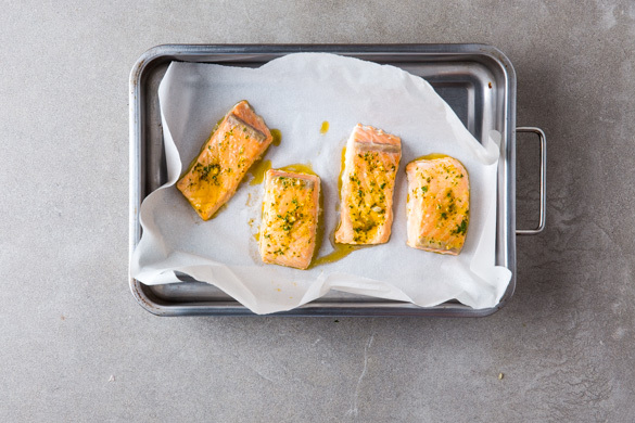 Die Lachsstücke in einer mit Backpapier ausgelegten Auflaufform während der letzten 8–10Min. der Backzeit mit zu den Kartoffeln in den Ofen geben und backen, bis der Fisch gar ist.