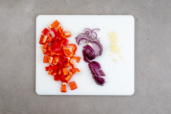 In einem großen Topf ausreichend leicht gesalzenes Wasser für den Grünkohl und die Gnocchi zum Kochen bringen. Die Paprika vierteln, entkernen und in ca. 1–2cm große Würfel schneiden. Die Zwiebeln schälen, halbieren und in dünne Streifen schneiden. Den Knoblauch schälen und grob hacken.