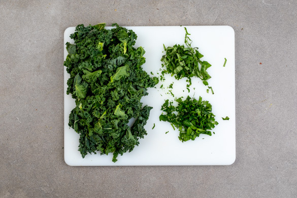 Den Grünkohl verlesen und ggf. trockene Stellen entfernen. Die Basilikum- und die Petersilienblätter von den Stängeln zupfen und grob hacken.