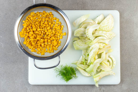 Den Fenchel längs halbieren und in ca. 1cm breite Streifen schneiden, dabei den Strunk entfernen. Ggf. vorhandenes Fenchelgrün fein schneiden und für die Garnitur beiseitelegen. Den Mais in einem Sieb kalt abspülen und abtropfen lassen.
