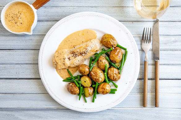 Nicht nur Familien wissen es schon längst: Feine Hausmannskost ist immer wieder der Hit! Heute gibt es zartes Hähnchen, das mit einer cremig-würzigen Sauce, grünen Bohnen und kleinen Kartöffelchen serviert wird. Ein Gericht, das garantiert glücklich macht!