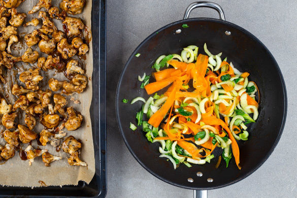 Die 1/2 der Sauce auf dem Blumenkohl verteilen und den Blumenkohl weitere 6–7Min. backen. Die Karotten und den Pak Choi in einer mittelgroßen Pfanne mit 1–2TL Pflanzenöl bei mittlerer Hitze ca. 3Min. knackig anbraten.