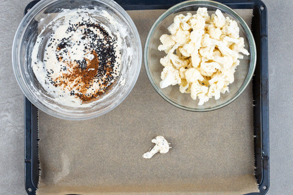 Den Ofen auf 220°C Umluft (240°C Ober-/Unterhitze) vorheizen. 8EL Mehl, 100ml Wasser, 1/4 des Sesams, die 1/2 der Gewürzmischung und 1 Prise Salz zu einem zähflüssigen Teig verrühren, ggf. etwas mehr Wasser hinzugeben. Den Blumenkohl in ca. 2cm große Röschen schneiden, mit dem Teig ummanteln und auf einem mit Backpapier ausgelegten Backblech im Ofen ca. 15Min. goldbraun backen.