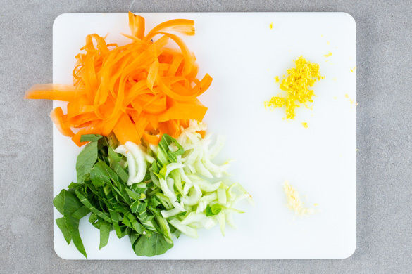 Die Karotten schälen und mit dem Sparschäler in lange Streifen schneiden. Den Pak Choi in feine Streifen schneiden. Den Knoblauch und den Ingwer schälen und fein reiben.