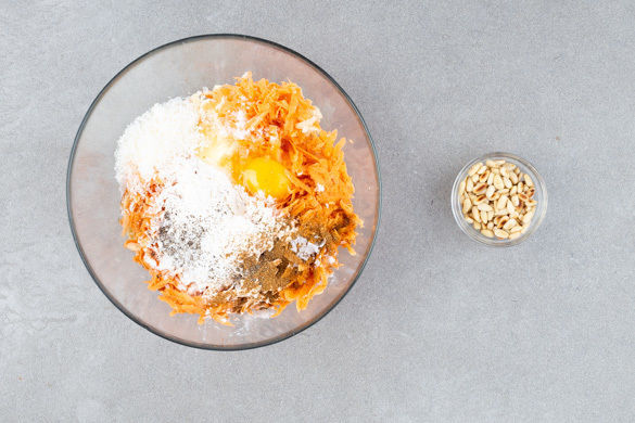 Die Pinienkerne in einer großen Pfanne ohne Fett ca. 2Min. anrösten. Die Süßkartoffel-Pastinaken-Raspel mit dem Käse, 1 Ei, 5EL Mehl, ca. 2/3 der Gewürzmischung sowie je 1/4TL Salz und Pfeffer verkneten. Die Röstimasse in 8 gleich große Portionen teilen und diese in der Pfanne mit 1EL Olivenöl bei mittlerer Hitze auf jeder Seite 3–4Min. knusprig anbraten.