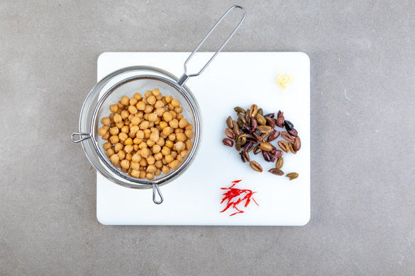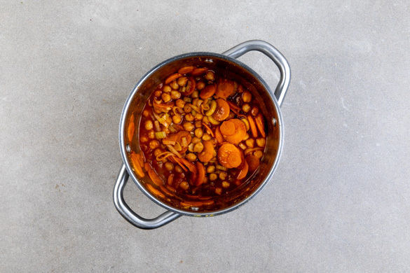Die Kichererbsen und ca. 3/4 des Knoblauchs in einem mittelgroßen Topf mit 1EL Olivenöl bei mittlerer Hitze 2–3Min. anschwitzen. Mit der 1/2 der passierten Tomaten ablöschen und mit der Gewürzmischung abschmecken. Bei niedriger Hitze 8–10Min. köcheln lassen. Nach Wunsch mit den Peperonistreifen verfeinern. Tipp: Den Rest der Tomaten z. B. für ein Pastagericht verwenden.