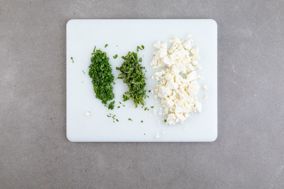 Die Petersilienblätter von den Stängeln zupfen und fein hacken. Die Oreganoblättchen abstreifen und fein schneiden. Den Käse mit den Fingern oder einer Gabel grob zerkrümeln.