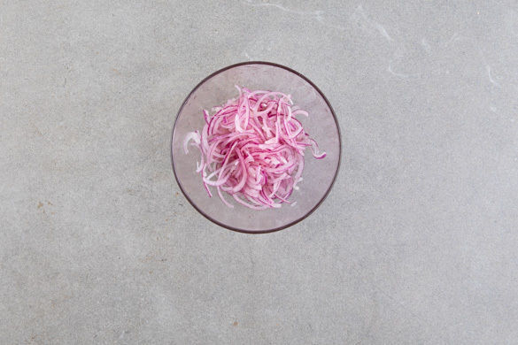 Den Backofen auf 180°C Umluft (200°C Ober-/Unterhitze) vorheizen. Die Zwiebel schälen, halbieren und in feine Streifen schneiden. Die Zwiebelstreifen mit 1/2TL Salz, 1TL Zucker und 1EL Essig mischen und ziehen lassen.