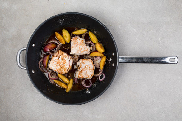 Die Zwiebeln und die Pflaumen zum Fleisch in die Pfanne geben und ca. 2Min. bei mittlerer Hitze in der Sauce einmal aufkochen lassen. Die Sauce nach Geschmack mit 1EL Balsamicoessig sowie Salz und Pfeffer würzen. Die Schweinesteaks mit der Sauce und dem Ofengemüse anrichten und servieren.