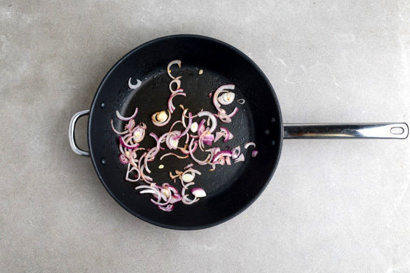 Die Zwiebeln in einer großen Pfanne mit 1EL Butter bei niedriger Hitze 4–5Min. glasig anbraten. Mit 1–2TL Provence-Kräutern und 1 Prise Salz würzen, dann aus der Pfanne nehmen und warm halten.