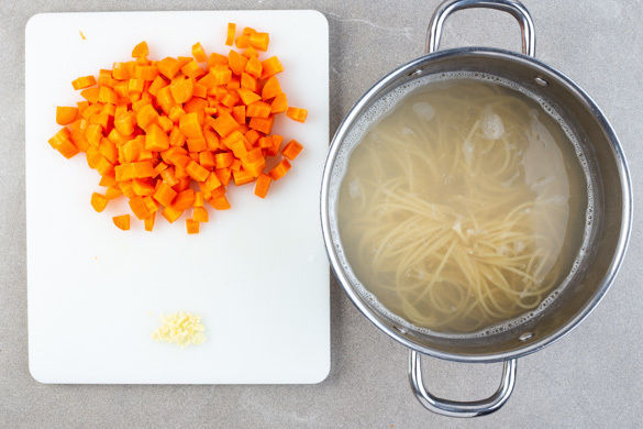 In einem mittelgroßen Topf mit ausreichend gesalzenes Wasser für die Pasta zum Kochen bringen. Inzwischen die Karotten schälen und in kleine Würfel schneiden. Den Knoblauch schälen und fein würfeln. Die Pasta in das kochende Wasser geben und in 7–9Min. bissfest kochen. Mit einer Tasse etwas Pastawasser abschöpfen, dann die Pasta in ein Sieb abgießen.