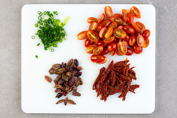 Die Kirschtomaten halbieren. Die Lauchzwiebel in feine Ringe schneiden. Die Oliven und die getrockneten Tomaten in feine Streifen schneiden.