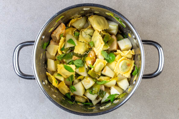 Gefüllte Pasta ist für sich schon eine Köstlichkeit. Kombiniert man die zarten Teigtäschchen mit ihrer aparten Füllung dazu noch mit saftigen Hähnchenwürfeln, fruchtiger Birne und knackigen Walnüssen, wird daraus im Nu eine zauberhafte Mahlzeit, die mit frischem Basilikum und würzigem Käse besser und besser wird!