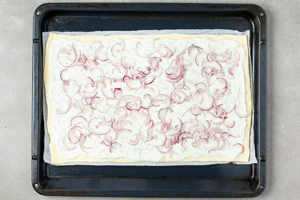 Die Dillcreme auf den Teigen verstreichen, an den Rändern ca. 1cm frei lassen. Die Zwiebeln auf der Creme verteilen und die Pizzen im Ofen in 15–20Min. goldbraun und knusprig backen. Je nach Ofen die Position der Bleche nach der Hälfte der Zeit tauschen.