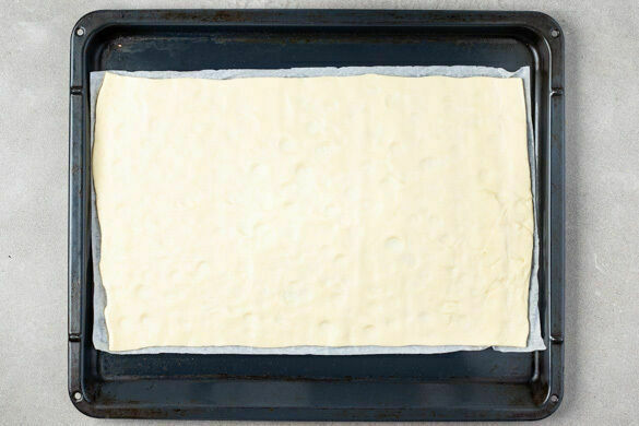 Die Teige mit dem Papier nach unten auf zwei Backblechen ausrollen und mit den Fingerspitzen leicht eindrücken.