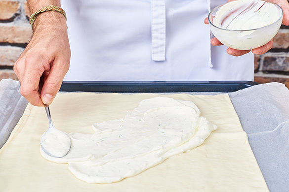 Den Teig mit dem Papier nach unten auf einem Backblech ausrollen und gleichmäßig mit der Creme bestreichen. Die Hähnchenstreifen darauf verteilen und mit Salz und Pfeffer würzen. Die Pizza im Ofen 10–12Min. backen.