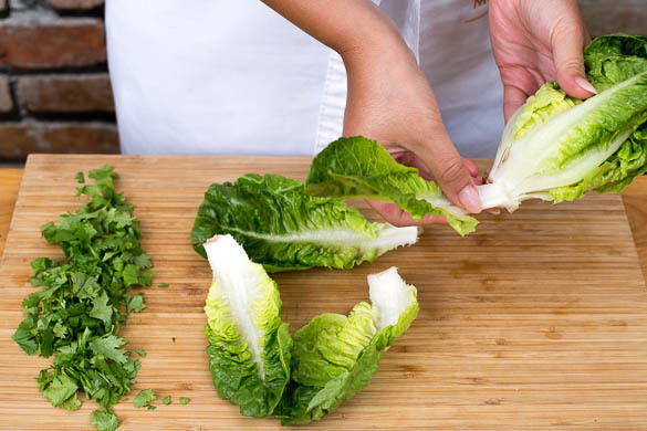 Die Salatblätter vorsichtig vom Strunk zupfen. Den Koriander samt Stängeln grob schneiden.