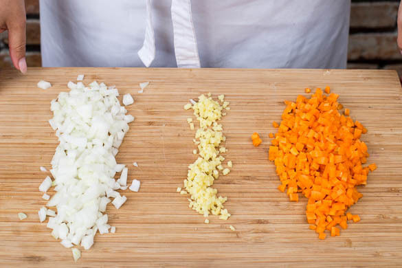 Die Karotten, die Zwiebel und den Ingwer schälen und in möglichst kleine Würfel schneiden.