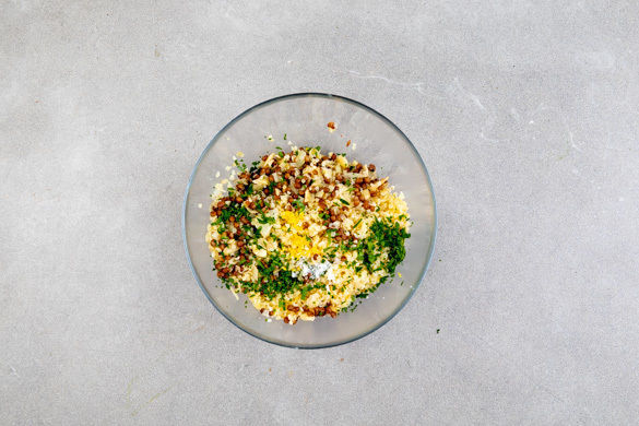 Den Bulgur in das kochende Wasser geben, einmal aufkochen und bei mittlerer Hitze abgedeckt in 8–10Min. bissfest kochen, dann in ein Sieb abgießen. Den Bulgur mit den Linsen vermengen und mit der 1/2 der gehackten Kräuter, 1TL Zitronenabrieb, 1TL Zitronensaft sowie 1 Prise Salz und Zucker würzen.