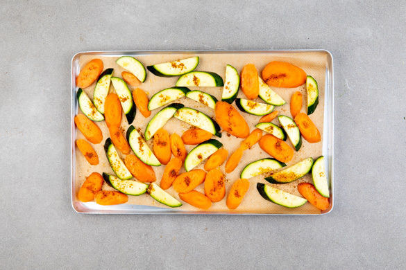 Das Gemüse mit 1EL Olivenöl und der Gewürzmischung nach Geschmack vermengen, gleichmäßig auf einem Backblech verteilen und 15–20Min. im Ofen rösten, bis die Karotten gar und die Zucchini goldbraun sind.