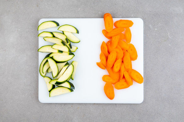 Den Backofen auf 200°C Umluft (220°C Ober-/Unterhitze) vorheizen. Die Karotte schälen und in 0,5–1cm breite, schräge Scheiben schneiden. Die Zucchini längs halbieren und ebenfalls in 0,5–1cm breite, schräge Scheiben schneiden.
