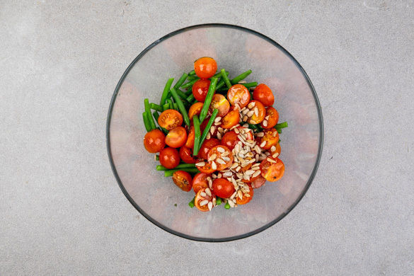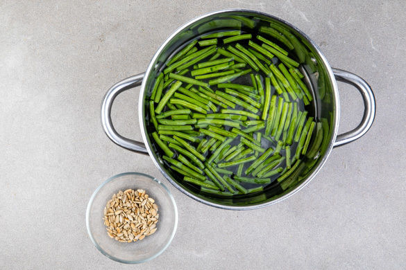 Die Sonnenblumenkerne in einem mittelgroßen Topf bei mittlerer Hitze ohne Zugabe von Fett ca. 2Min. anrösten. Zum Abkühlen aus dem Topf nehmen. In demselben Topf ausreichend Wasser für die Bohnen zum Kochen bringen. Die Enden der Bohnen entfernen, die Bohnen halbieren und in das kochende Wasser geben. Abgedeckt 5–6Min. kochen, bis die Bohnen bissfest sind. In ein Sieb abgießen.