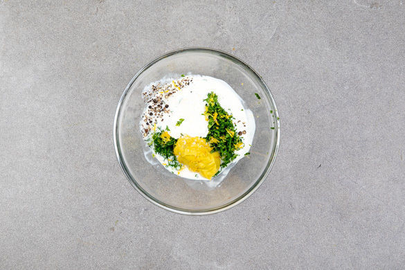 Die Kräuter mit dem Senf, dem Zitronenabrieb, dem Zitronensaft und der 1/2 der Sojasahne verrühren. Mit Salz und Pfeffer würzen und ggf. mit mehr Sojasahne verdünnen.