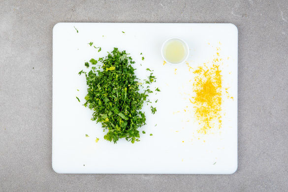 Die Kräuter samt Stängeln fein schneiden. Die Zitronenschale abreiben, dann die Zitrone halbieren und auspressen.