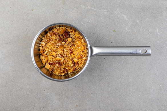 Sobald die Butter geschmolzen ist, den Topf vom Herd nehmen und die Keksbrösel, die Pekannüsse und den Ingwer untermengen. Die Keksmasse auf zwei Gläser oder andere Dessertschalen verteilen. Den Topf kurz auskühlen lassen, dann mit etwas Küchenkrepp auswischen und beiseitestellen.
