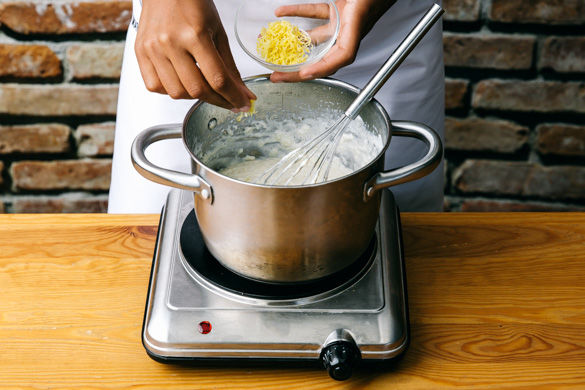 Die Milch mit 600ml Wasser in einem großen Topf zum Kochen bringen. Vorsicht, die Milch darf nicht überkochen oder anbrennen. Sobald sich kleine Bläschen bilden, die Milch nicht aus den Augen lassen.