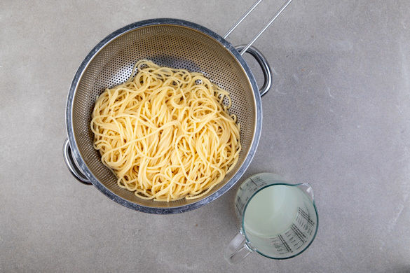 Die Pasta in das kochende Wasser geben und in 7–9Min. bissfest kochen. In ein Sieb abgießen, dabei 1 Tasse Pastawasser auffangen, dann zurück in den Topf geben und warm halten.