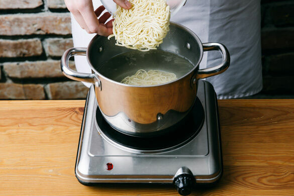 Die Nudeln in das kochende Wasser geben und in 3–5Min. bissfest kochen. In ein Sieb abgießen und kalt abschrecken.