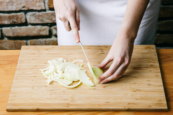Die Zwiebel schälen, halbieren und in feine Streifen schneiden. In einem großen Topf ausreichend gesalzenes Wasser für die Nudeln zum Kochen bringen.