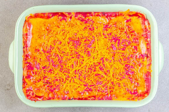 In einer mittelgroßen Auflaufform nacheinander etwas Rote-Bete-Béchamel, eine Schicht Lasagneplatten und etwas Hackfleisch-Spinat-Mischung schichten. Den Vorgang 3–5 Mal wiederholen, bis die Hackfleisch-Spinat-Mischung aufgebraucht ist. Mit einer Schicht Rote-Bete-Béchamel abschließen und den Käse über die Lasagne streuen.