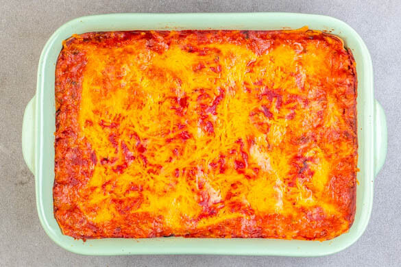 Die Lasagne mit Alufolie abdecken und ca. 15Min. im Ofen backen, dann die Folie entfernen und weitere ca. 10Min. backen, bis der Käse goldbraun ist.