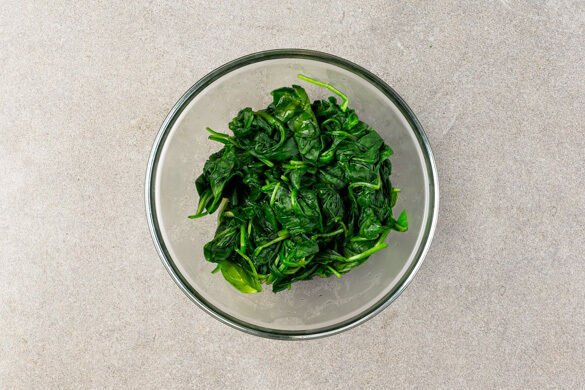 Den Spinat waschen und in einem Sieb mit dem kochenden Wasser übergießen, sodass der Spinat zusammenfällt. Abtropfen lassen und in eine kleine Schüssel geben.