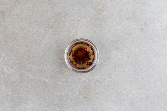 Den Backofen auf 240°C (220°C Umluft) vorheizen. Die ½ der Chiliflocken in 1EL warmem Wasser einweichen und beiseitestellen. Die übrigen Chiliflocken für ein anderes Rezept aufbewahren.