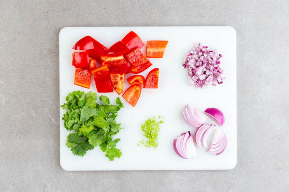 Die Paprika vierteln, entkernen und in ca. 2cm große Stücke schneiden. Die Korianderblätter von den Stängeln zupfen, die Stängel fein schneiden. Die Zwiebel schälen und halbieren, eine Hälfte in dünne Spalten schneiden, die andere Hälfte fein würfeln.
