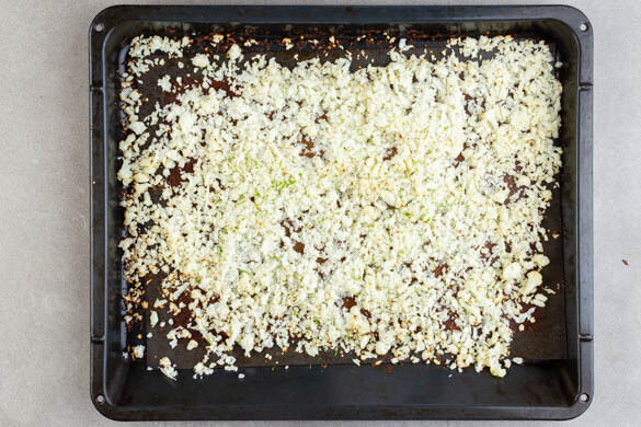 Ca. 15Min. vor Ende der Garzeit des Fleisches die Limettenschale abreiben, dann die Limette halbieren und auspressen. Den Blumenkohlreis mit 1EL Olivenöl sowie je 1 Prise Salz und Pfeffer vermengen, auf einem mit Backpapier ausgelegten Backblech verteilen und ca. 10Min. im Ofen backen, bis er leicht gebräunt ist. Mit der Limettenschale vermengen.