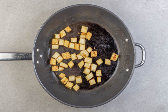 Den Tofu mit Küchenkrepp sanft auspressen und in 2–3cm große Würfel schneiden. In einer großen Pfanne mit 2EL Pflanzenöl und 1 kräftigen Prise Salz bei mittlerer Hitze in 6–9Min. rundum goldbraun braten.