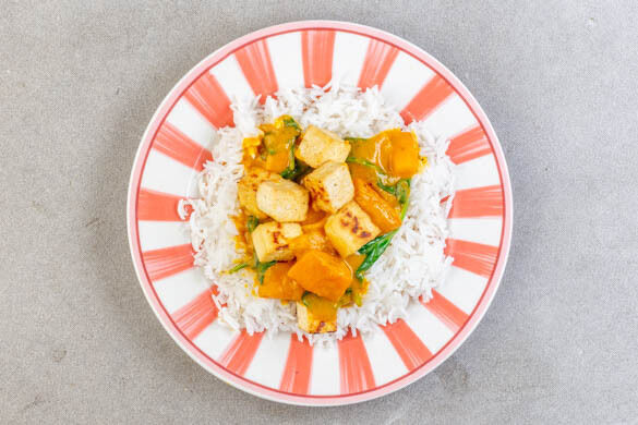Den Tofu auf dem Curry anrichten und mit dem Reis servieren.