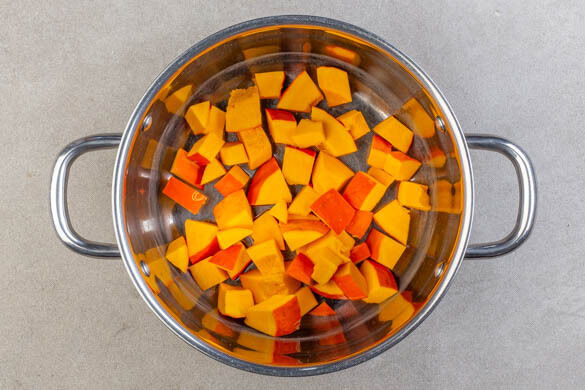 Den Kürbis samt Schale halbieren, entkernen und in ca. 2cm große Würfel schneiden. In einem großen Topf mit 2EL Pflanzenöl und ½TL Salz bei mittlerer bis starker Hitze unter häufigem Rühren ca. 3Min. anbraten.