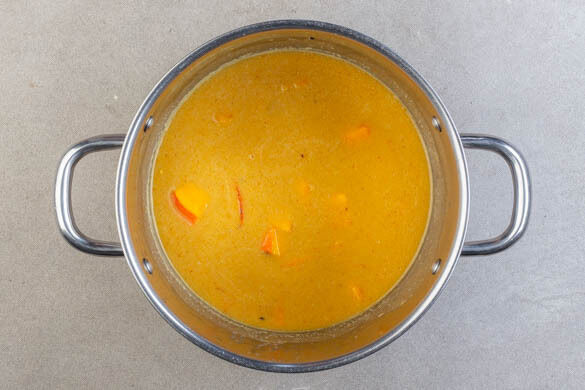 Die Currypaste zugeben und ca. 1Min. mitbraten. Die Kokosmilch und 150–200ml Wasser einrühren und das Curry abgedeckt 11–16Min. köcheln lassen, bis der Kürbis weich ist. Dabei häufig umrühren.