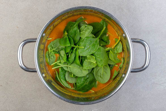 Den Spinat portionsweise zum Curry geben und zusammenfallen lassen. Das Curry vom Herd nehmen, mit 1EL Essig würzen und mit Salz und Pfeffer abschmecken.