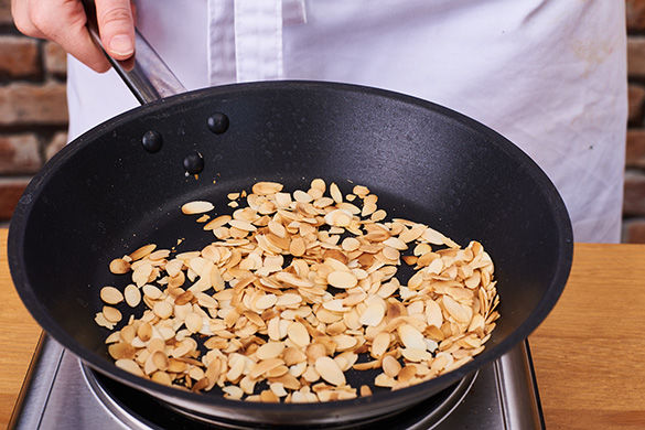 In einer großen Pfanne die Mandeln ohne Öl 1-2Min. goldbraun rösten und aus der Pfanne nehmen.