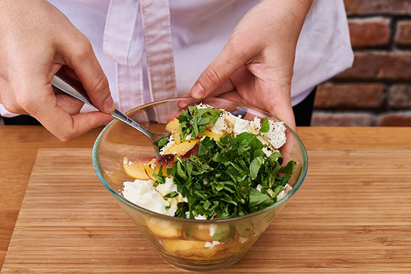 Die Pfirsiche halbieren, den Stein entfernen und die Hälften in Scheiben schneiden. Wenn die Pfirsiche noch etwas hart sind, die Scheiben mit ein bis zwei Prisen Zucker bestreuen und für ca. 5min. ziehen lassen. Den Basilikum von den Stängeln zupfen und grob hacken.