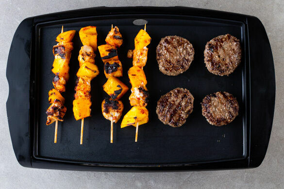 Sommerzeit ist BBQ-Zeit! Die leckeren, leicht pikanten Mango-Hähnchen-Spieße und die saftigen Hacksteaks mit Ingwer und Knoblauch lassen sich prima vorbereiten und sind der Star bei jedem Grillnachmittag im Garten oder beim Picknick im Park. Und falls Petrus keine Sonne schickt, kannst du alles auch ganz einfach in der Grillpfanne auf dem Herd zubereiten.