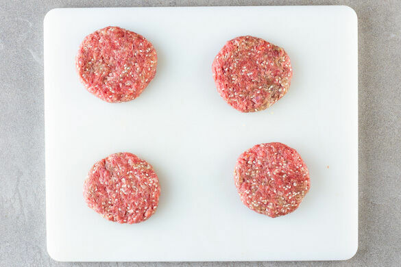 Den Knoblauch und den Ingwer schälen und fein reiben oder sehr fein würfeln. Das Hackfleisch mit dem Knoblauch, dem Ingwer, dem Sesam und 1 Prise Salz gut verkneten und aus der Masse 4 kleine Hacksteaks formen.