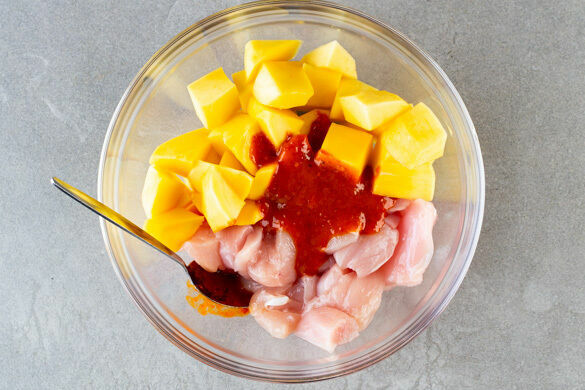 Die Mango schälen. Das Fruchtfleisch dicht am Kern entlang abschneiden und in 2–3cm große Würfel schneiden. Das Hähnchen mit etwas Küchenkrepp trocken tupfen und ebenfalls in 2–3cm große Würfel schneiden. Die Mango- und die Hähnchenwürfel mit der Würzsauce vermengen.