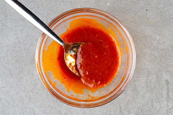 Den Grill vorbereiten. Die Holzspieße in kaltem Wasser einweichen. Das Sambal Oelek mit 1EL Pflanzenöl, 1/2EL Essig und 1 Prise Salz zu einer Würzsauce verrühren.